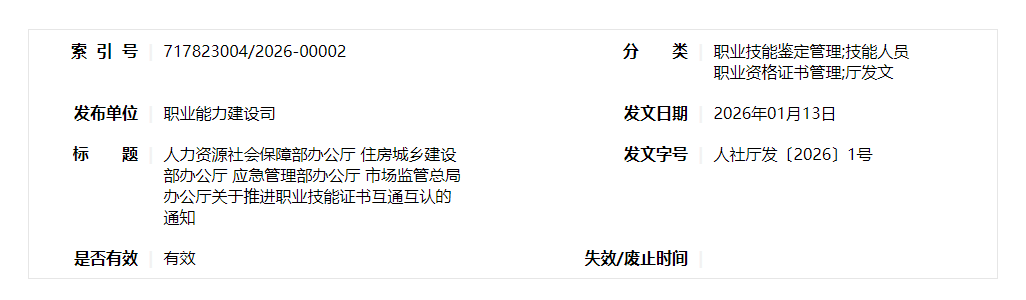 为贯彻落实党中央、国务院关于加快全国统一大市场建设、优化营商环境、促进高质量充分就业等决策部署,减轻劳动者技能评价取证负担,提升技能评价服务效能,现就推进职业技能证书(含技能人员职业资格证书、职业技能等级证书)互通互认事项通知如下。