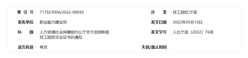 为落实习近平总书记关于大力发展技工教育的重要指示精神,支持技工院校毕业生各项政策待遇落实,根据《技工教育“十四五”规划》(人社部发〔2021〕86号)部署安排,决定在全国技工院校启用新版(2022年版)毕业证书,现将有关事宜通知如下: